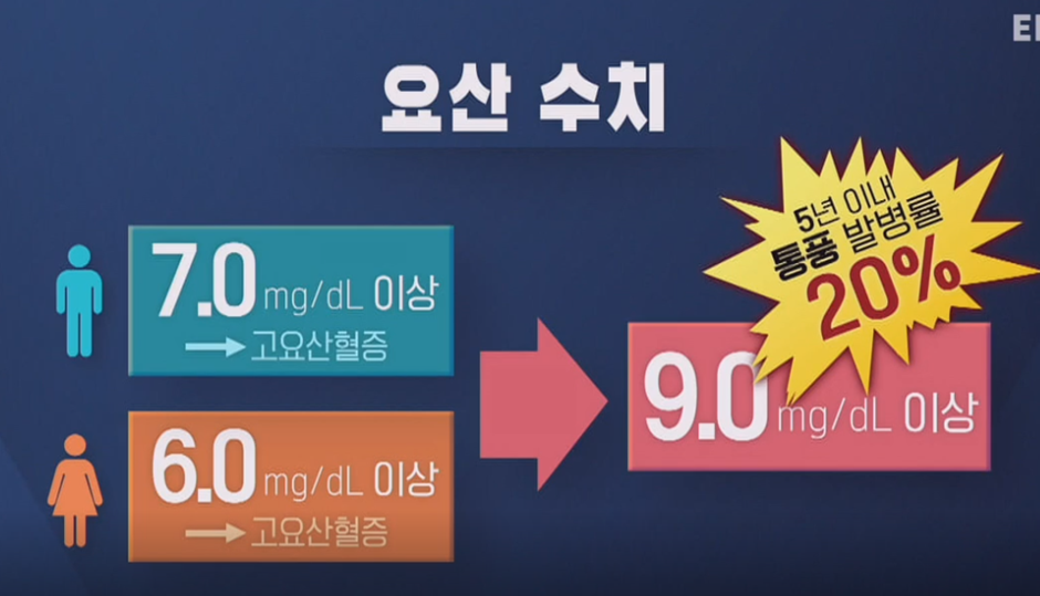 그렇다면 요산 수치가 얼만큼 되어야 해로운 걸까요? 혈액 1dl에서 남자는 7.0mg/dl 이상 여성은 6.0mg이상이면 고요산혈증이라 불립니다. 그리고 요산이 9.0mg/ld이상을 유지하면 5년이내 통풍 발생이 20퍼센트가 됩니다.
