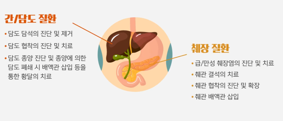 ERCP는 크게 간/담도와 췌장 질환의 경우 치료를 합니다.
